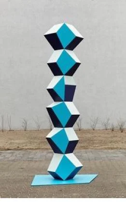 One of Bulloch’s fundamental themes is the integration of the human subject with technology. These newer works – 10 foot tall stacked columns of polyhedra, formed in steel or MDF, were conceived and designed within a digital imaging program. With stylized geometry and a manufactured surface sheen, they reinforce a sense of ‘retro-futurity.’