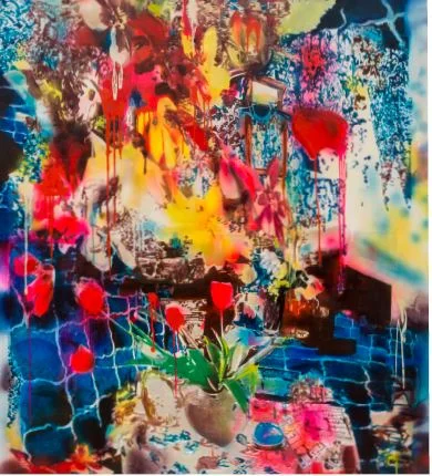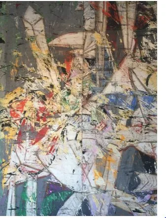 Acrylic, xerox transfer, spray paint, enamel and oil on canvas